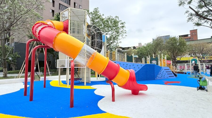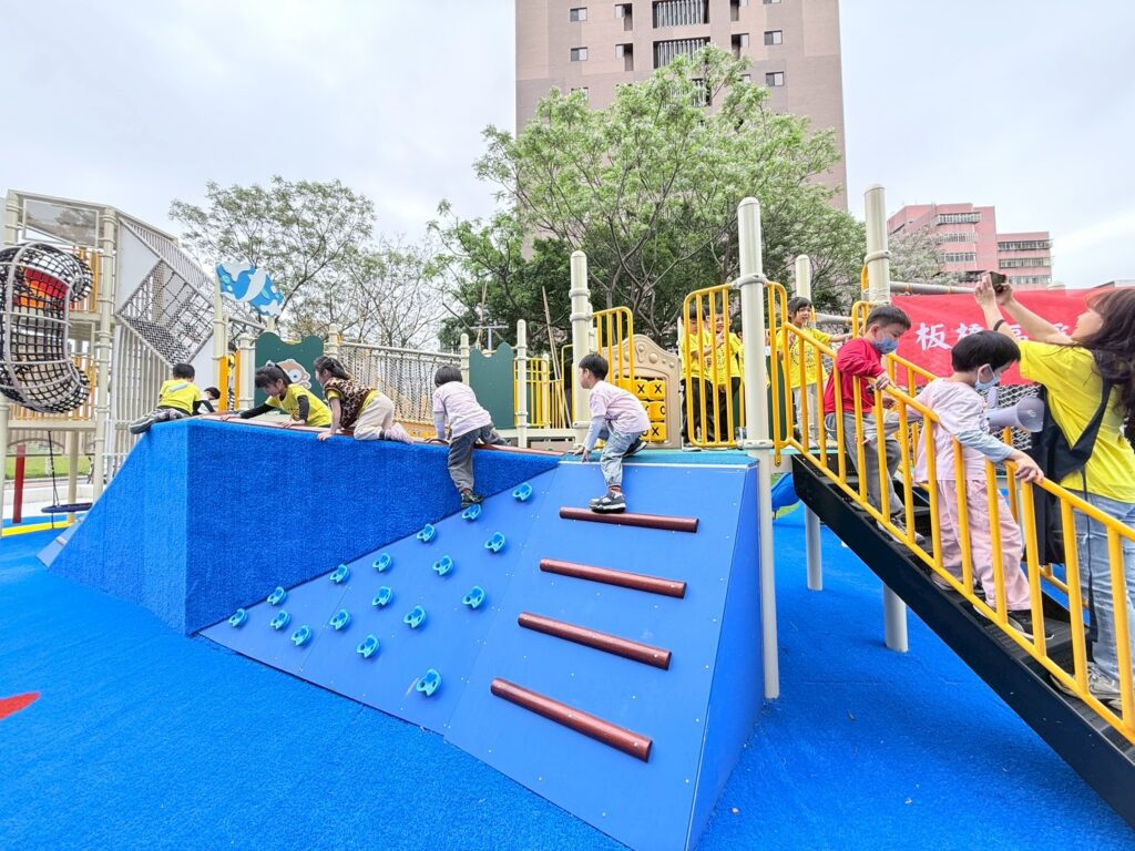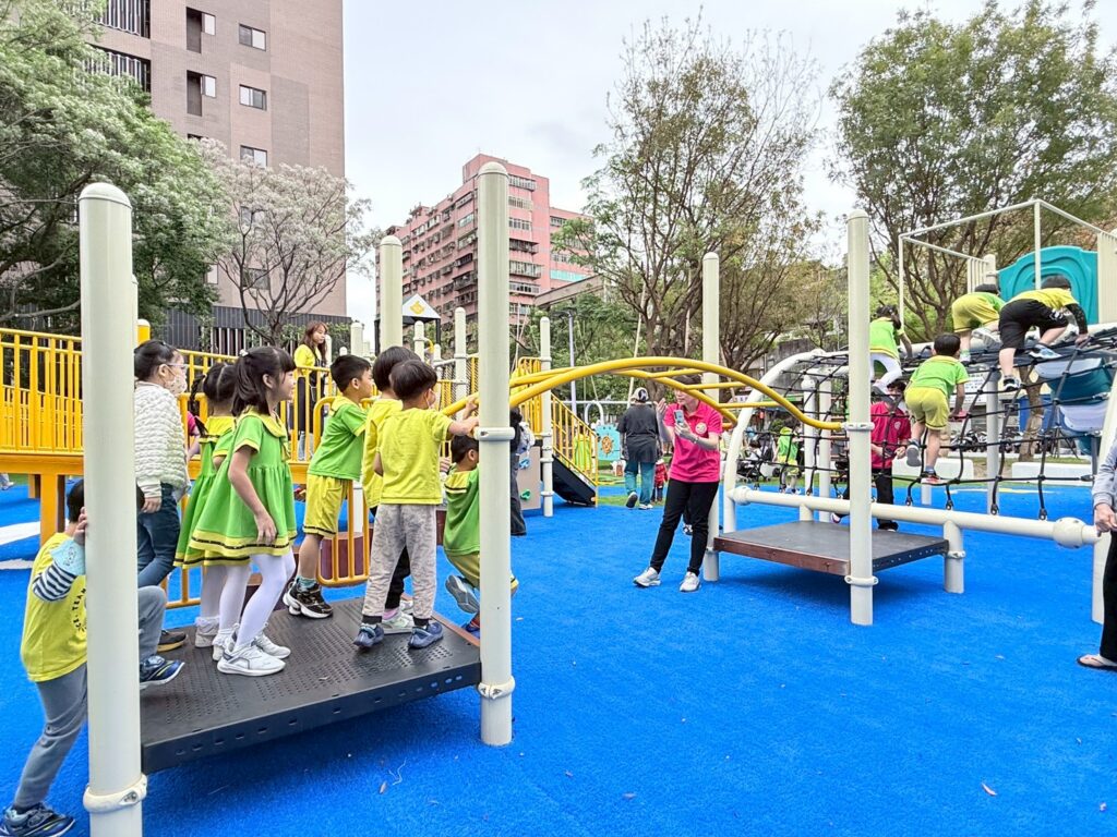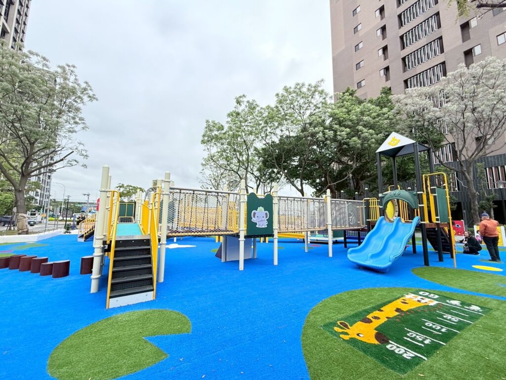 公園內設置全新的大型複合式遊具,主體採用吸睛的「魚躍龍門」造型設計,設計巧妙連結了立體爬網空間、攀岩塊斜面及組合遊具。此外,周邊配置了共融森林轉盤、共融鞦韆、共融溜滑梯與多款造型搖搖樂,其中包含與主題呼應的藍色魚兒造型,能有效訓練孩童的抓握力與平衡感。全區鋪設嶄新的安全彈性地墊與造型人工草皮,大幅提升緩衝保護,搭配無障礙多功能通道,讓不同能力的孩童都能安心挑戰各項關卡。