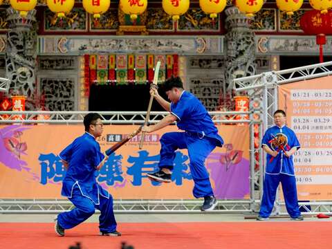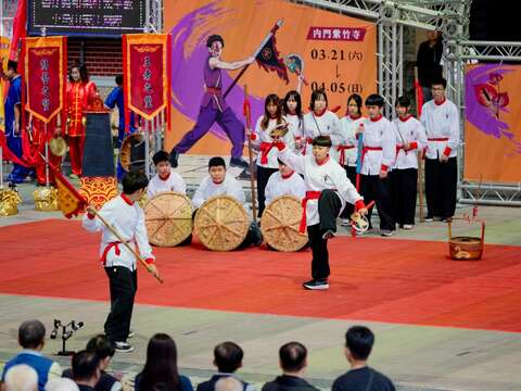 內門紫竹寺主委劉銀城指出,感謝交通部觀光署、高雄市政府觀光局、民政局及內門區公所的鼎力支持與資源挹注。今年宋江陣將於3月21日開幕,屆時將以最高規格的古禮「青刀巷」迎賓,並透過陣頭拜觀音儀式,由在地宋江陣、獅陣、牛犁陣等文武陣頭齊聚廟埕,向觀音佛祖展演以示尊崇、並祈求遶境平安。重頭戲「羅漢門迎佛祖」遶境,將於3月28日、29日及4月4日、5日共四天盛大舉行;此些活動不僅是內門地區年度最重要的民俗盛事,更是透過徒步遶境祈求合境平安,緊密凝聚地方居民的情感與向心力,充分展現台灣在地信仰的豐沛能量。圖1. 2026高雄內門宋江陣記者會由「內門國中宋江陣」 及「宗興武藝創意宋江陣」精彩尬陣表演揭開序幕。