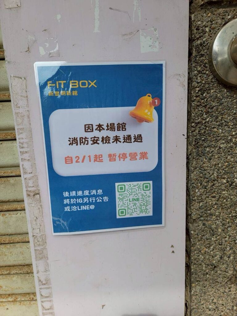 消保官陳雅芳表示,海安健核有限公司向明新科技大學承租女生宿舍愛苑1樓經營「FITBOX GYM新豐明新館」健身中心,因違反消防法遭縣府要求限期改善,業者於官網公告「因本場館消防安檢未通過,自115年2月1日到起暫停營業,後續進度消息另行公告」,引起消費者擔心權益受損。