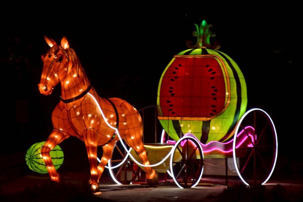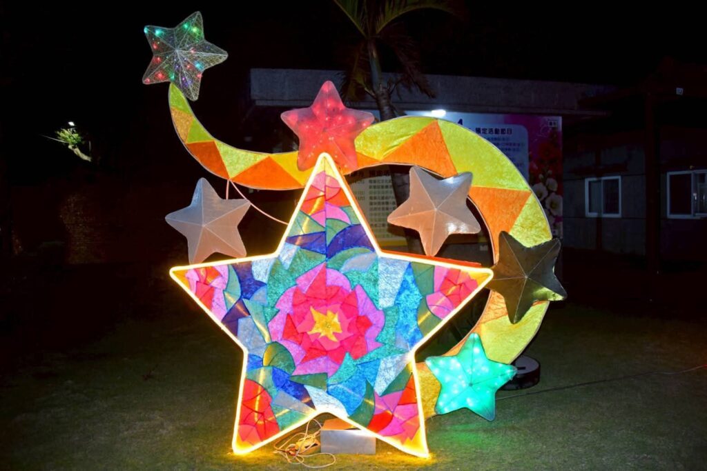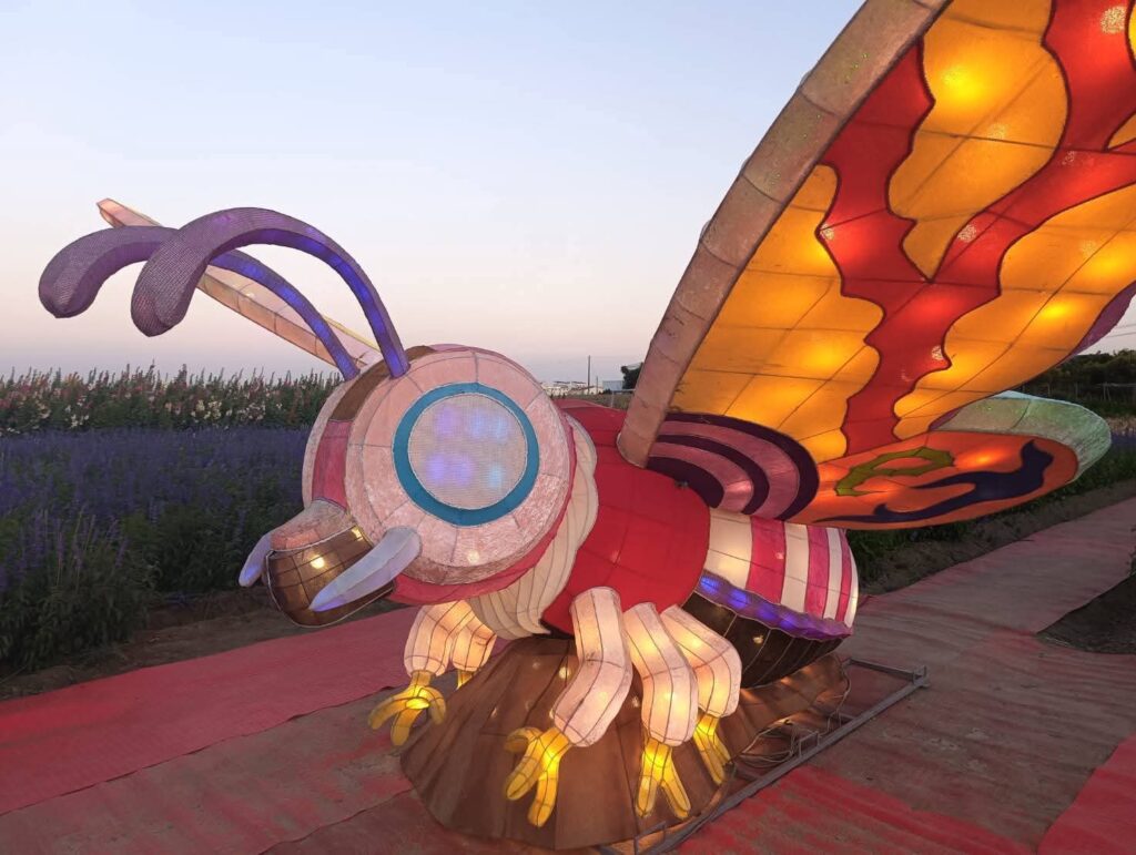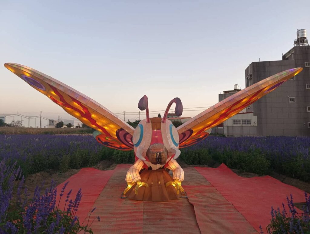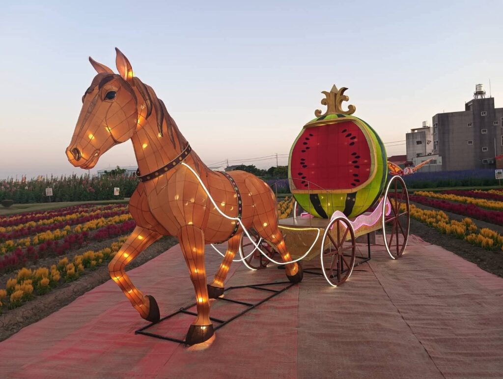 夜幕降臨後,園區內燈光逐漸亮起,柔和燈影與繽紛花海相互映襯,讓高聳的蜀葵花在燈光點綴下更顯夢幻迷人。園區人氣裝置 「西瓜馬車」 以及深受大小朋友喜愛的 「摩斯拉」 主題燈飾及各式花燈,在夜晚燈光映照下更顯亮眼,成為遊客拍照打卡的熱門景點。