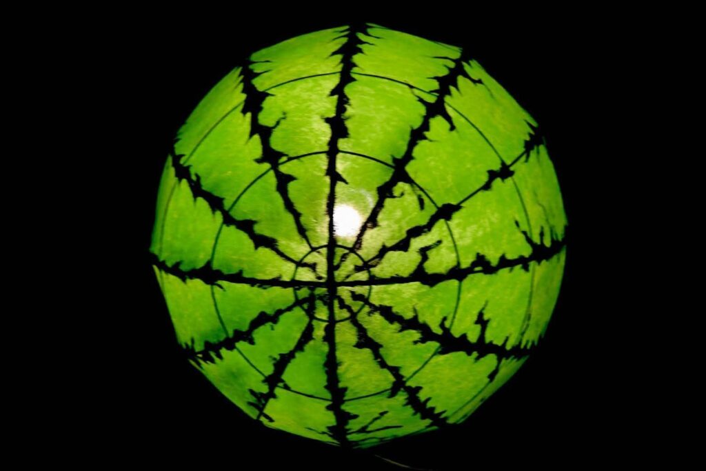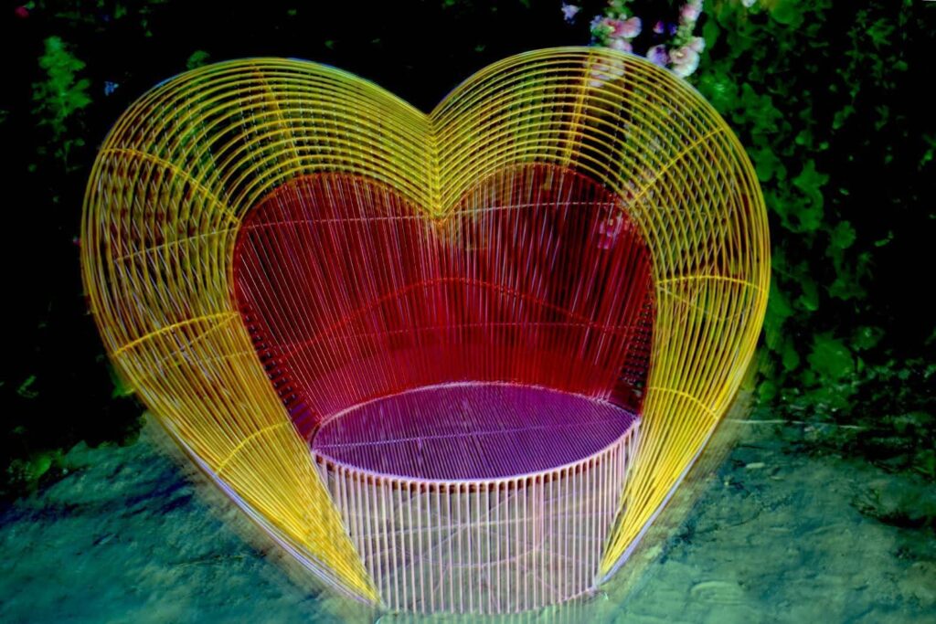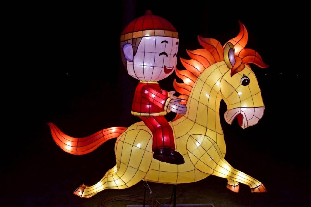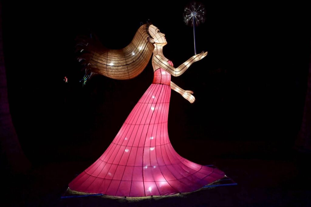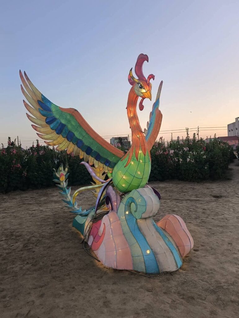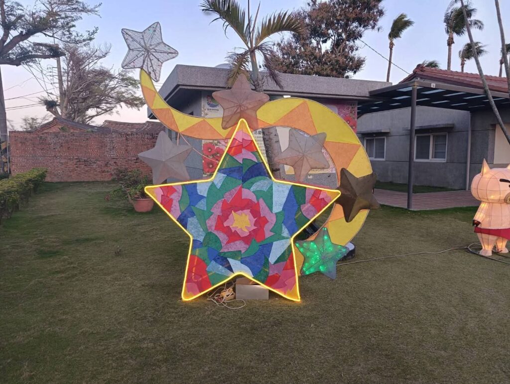 夜幕降臨後,園區內燈光逐漸亮起,柔和燈影與繽紛花海相互映襯,讓高聳的蜀葵花在燈光點綴下更顯夢幻迷人。園區人氣裝置 「西瓜馬車」 以及深受大小朋友喜愛的 「摩斯拉」 主題燈飾及各式花燈,在夜晚燈光映照下更顯亮眼,成為遊客拍照打卡的熱門景點。