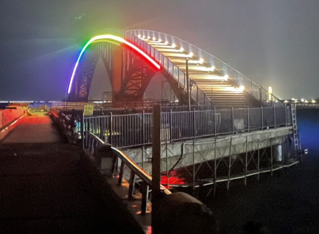 澎湖縣政府辦理觀音亭西瀛虹橋、國際廣場鋼便橋及通梁鋼便橋等3座人行橋鋼構防蝕及景觀燈光改善工程,相關作業已大致完成,其中西瀛虹橋彩虹景觀燈將於夜間啟用,為港區夜晚增添嶄新風貌。