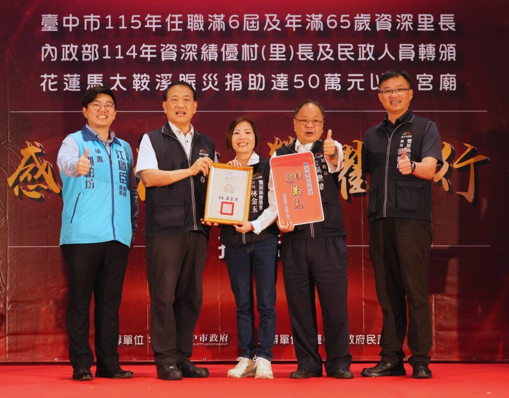 除向基層致敬,民政局也特別感謝7間宮廟於去年花蓮馬太鞍溪堰塞湖溢流災害發生後,主動捐贈50萬元以上善款,協助提升救災量能,其中南屯萬和宮及清水紫雲巖各捐贈200萬元;西屯惠來里福德祠及北區重生堂各捐贈60萬元;南區醒修宮、豐原慈濟宮及北區寶覺寺各捐贈50萬元。民政局指出,宗教團體在災害發生時主動伸出援手,展現回饋社會的正向力量,不僅為災區注入溫暖,也成為政府推動救災工作的有力後盾。